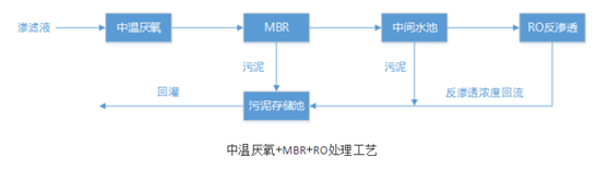 滲濾液通過調(diào)節(jié)池流入到中溫厭氧池,經(jīng)大分子有機污染物降解后進入缺氧段MBR反應(yīng)器中,與回流水混合進入好氧段MBR進行曝氣,去除滲濾液中的TN,好氧池出水進入MBR分離器,將分離的污泥濃液回流至MBR缺氧段,MBR出水進入反滲透系統(tǒng),滲濾液經(jīng)反滲透處理后實現(xiàn)達標排放。
